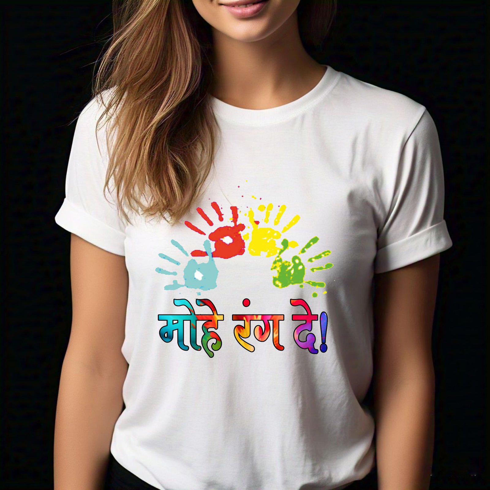 Celebrate Holi with the vibrant “Mohe Rang Do” printed T-shirt. Made from lightweight Sarina fabric, it offers comfort and style, making it perfect for festivities and gifting!