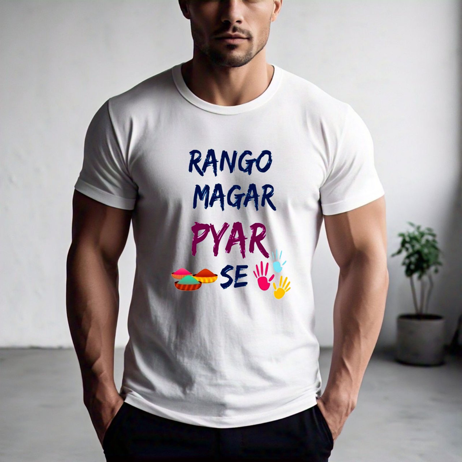 Printed with the vibrant message “Rango Magar Pyar Se”, this T-shirt radiates festive cheer. As a result, it brings a joyful and loving touch to your Holi celebrations, enhancing your festive wardrobe.